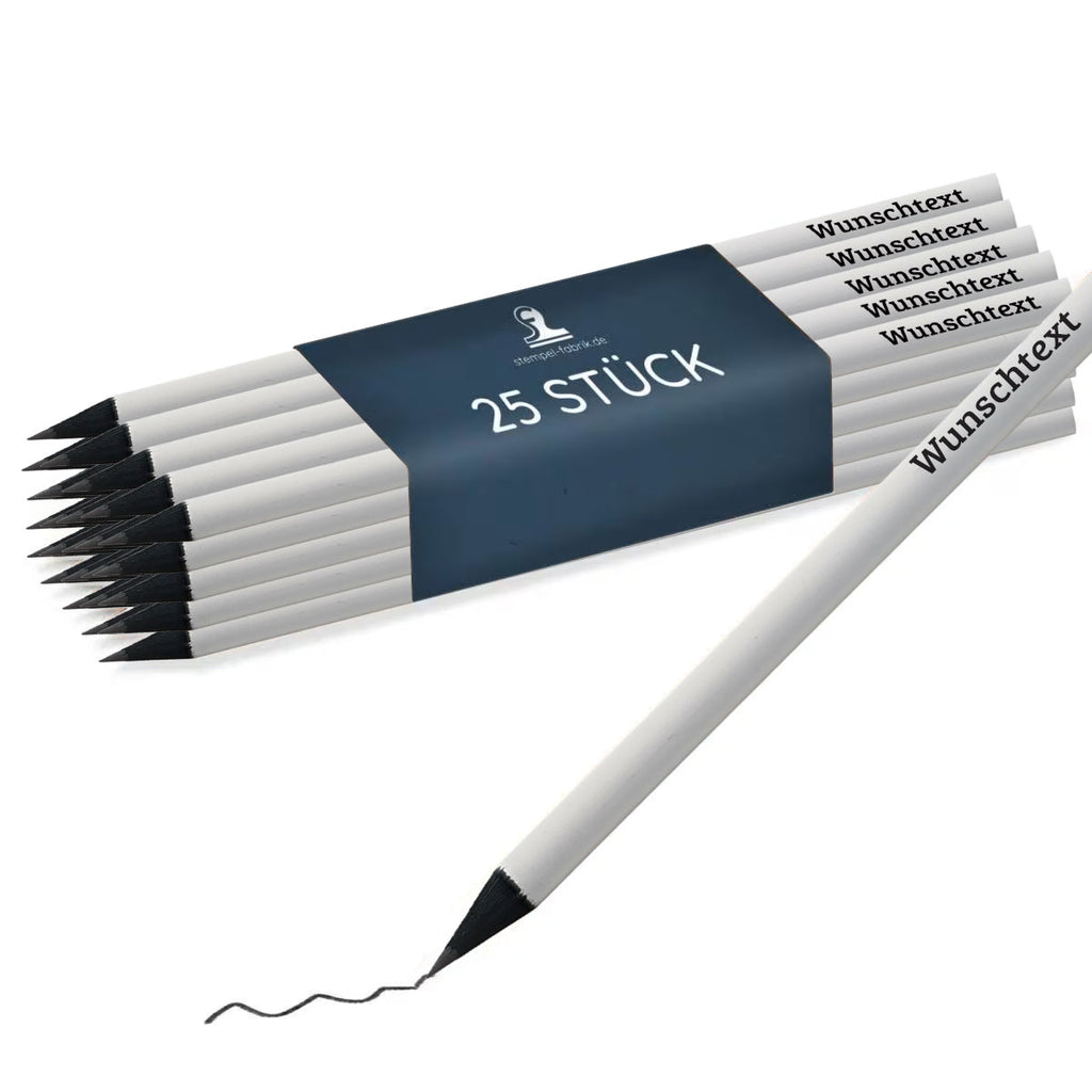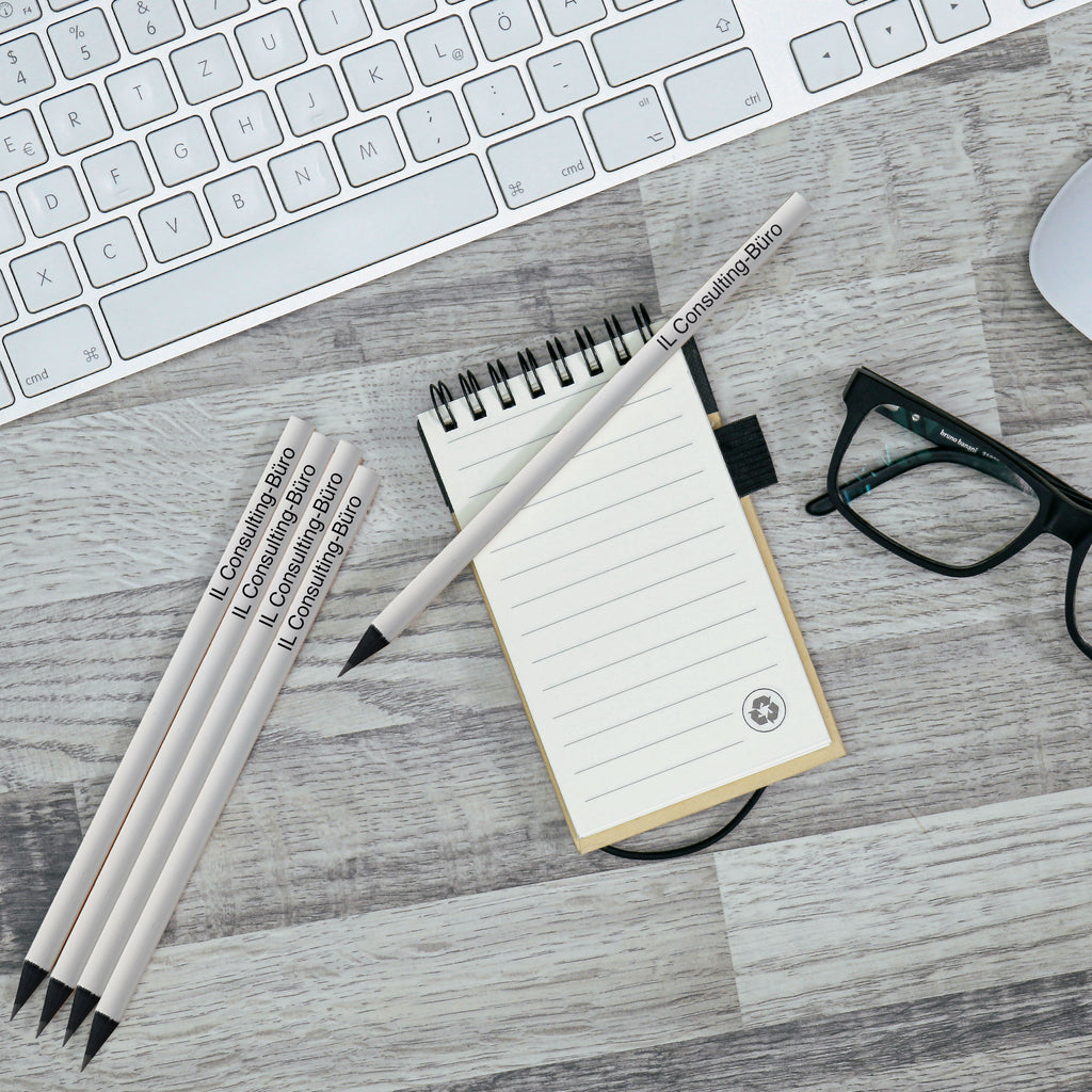 Unsere weißen, runden Bleistifte mit schwarzer Gravur überzeugen durch zeitloses Design, angenehmes Schreibgefühl und echte Individualität. Die Stifte sind weiß lackiert und wirken dadurch modern, clean und besonders edel. Unter der Lackierung ist das Holz schwarz durchgefärbt – so entsteht bei der Gravur der elegante schwarze Schriftzug. Das Ergebnis ist ein klar lesbarer, hochwertiger Ton-in-Ton-Kontrast. Die klassische runde Form liegt vertraut und leicht in der Hand und eignet sich optimal für den täglichen Einsatz in Schule, Büro oder Zuhause.