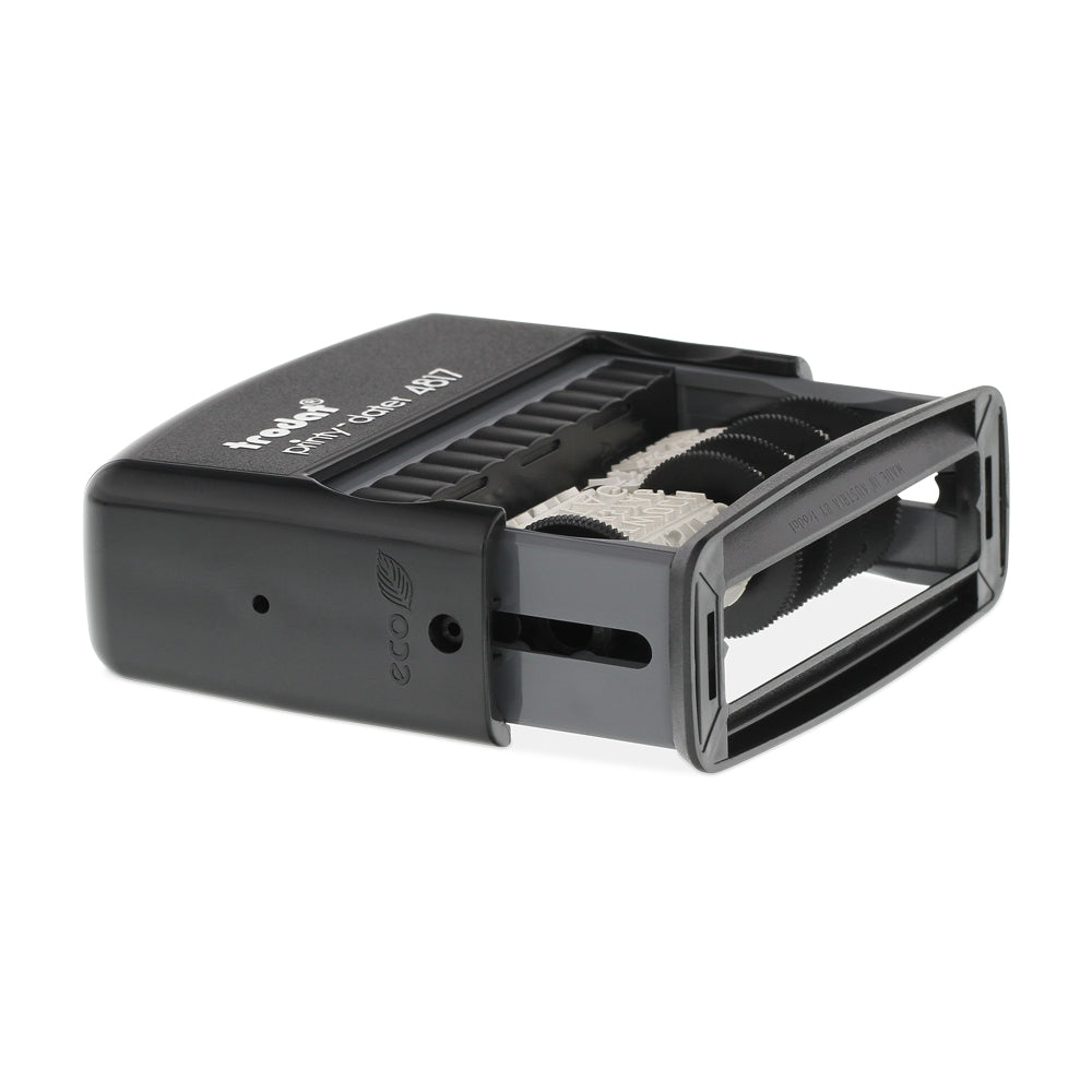 Trodat Printy 4817 ist ein selbstfärbender Stempel mit Datum und Wortband. Dieser Datumsstempel kombiniert mit 12 gängigen Texten für Büro und Administration. Gut leserliche Bänder und leicht verstellbare Rädchen. Abdruck schwarz 48 x 3,8 mm. GESCANNT AM, PER @-MAIL AM, TELEFONIERT AM, EINGEGANGEN AM, BESTELLT AM, ERLEDIGT AM, GEBUCHT AM, BEZAHLT AM, BETRAG ERH. AM, KONTROLLIERT AM, VERSENDET AM, FAKTURIERT AM Ersatzkissen 6/4817 in 5 Farben erhältlich: schwarz, blau, rot, grün und violett.